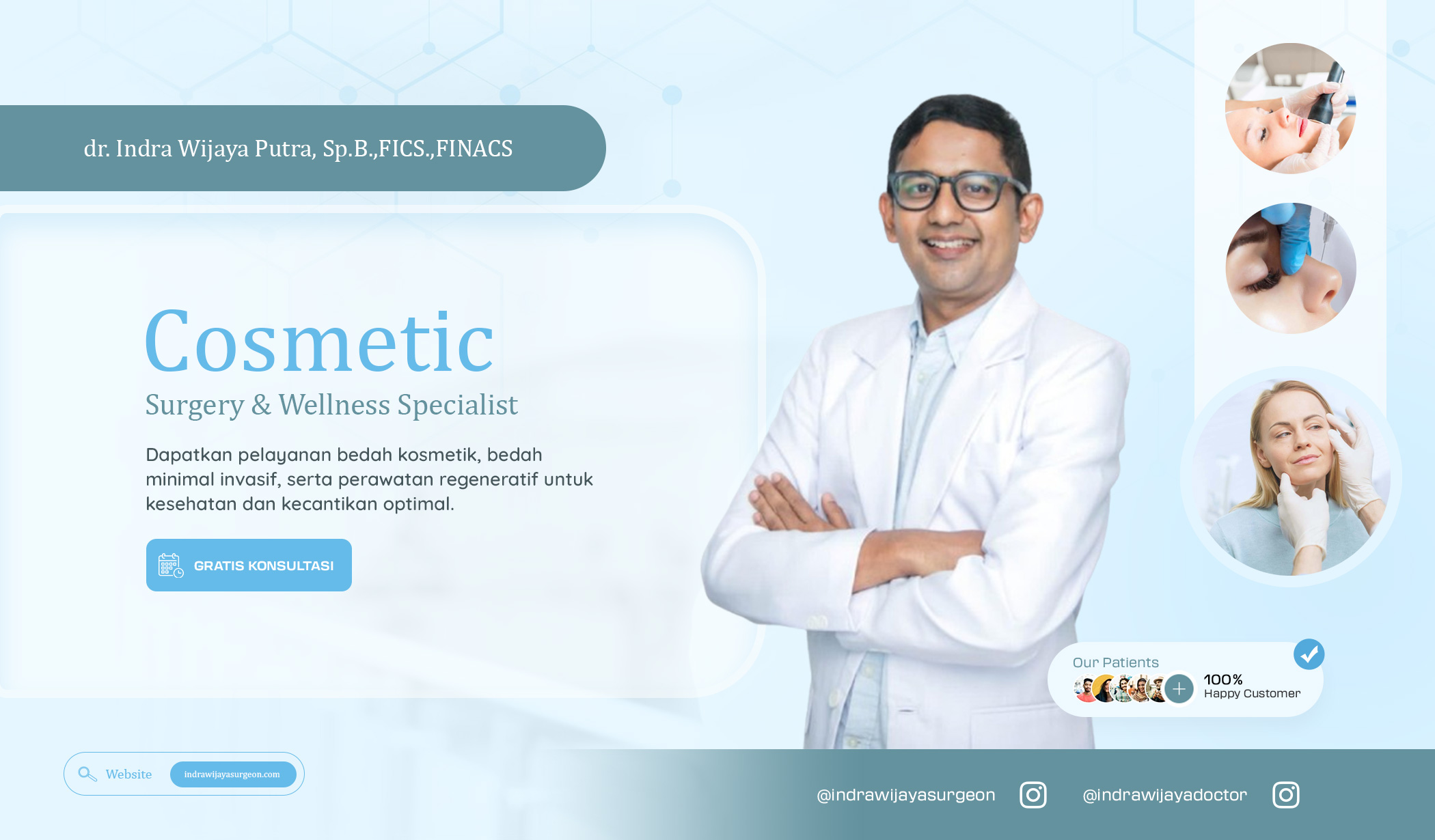 Dengan pengalaman lebih dari 10 tahun serta latar belakang pendidikan dan pelatihan, dr. Indra Wijaya Putra, Sp.B., FICS., FINACS memiliki keahlian yang terbukti di bidang Bedah Kosmetik & Wellness.